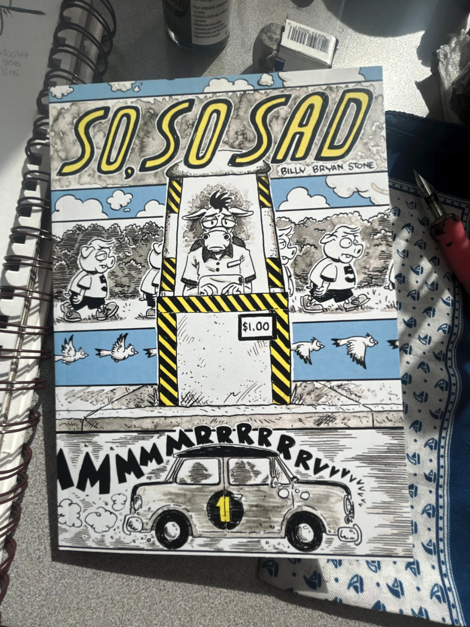 "So, So Sad" didn't start as a response to generative AI and our current "Faster is Better" culture, but it became that for me as I worked on it. Start to finish it took me about two and a half years. At the start I gave myself permission to enjoy the process and not worry about how long it was taking. I put as much love for the craft of making comics and as much of myself into it, and on the physical page, as possible.